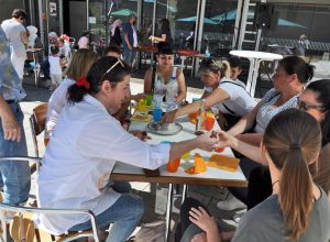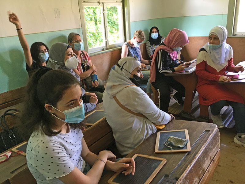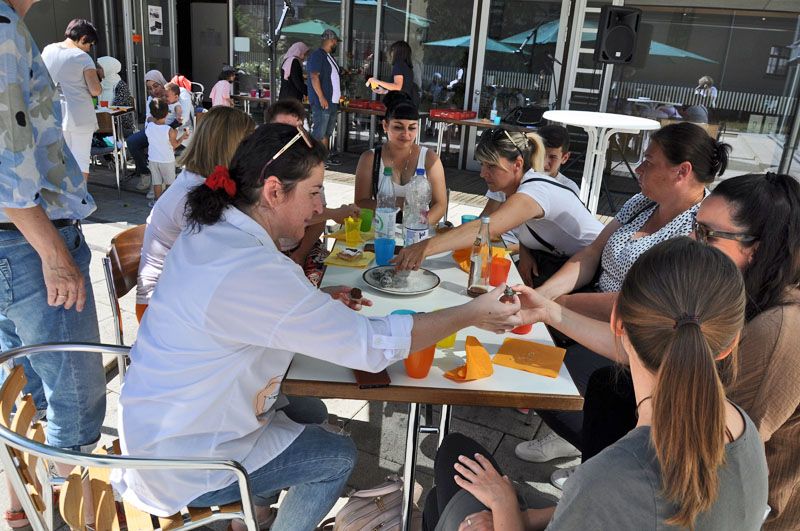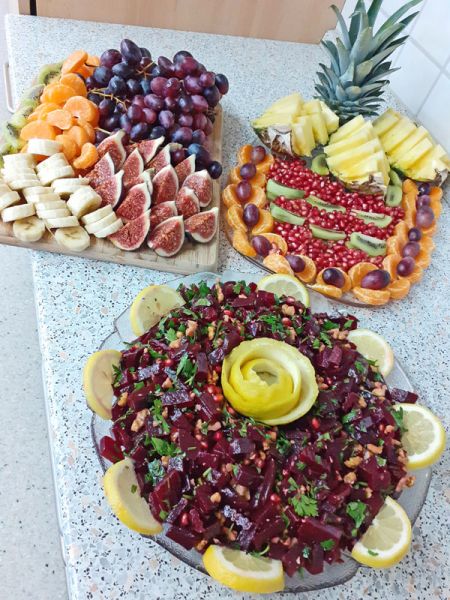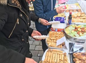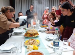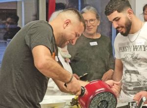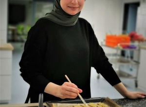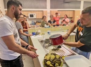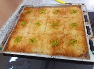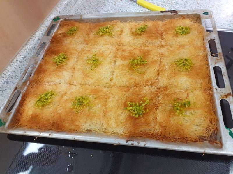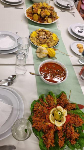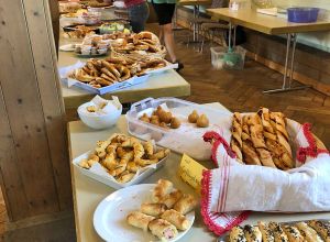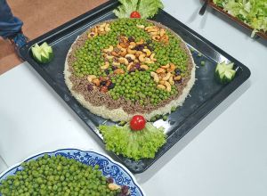 Hasan lies uns so einiges ausprobieren, wie zum Beispiel das feine „Baba Ghanoush“ - eine Auberginencreme, abgerundet mit feiner Sesam-Tahini, Knoblauch und Zitrone. Auch durften die feinmotorischen Fingerübungen beim Drehen der leckeren gefüllten Weinblätter (Yalanji) nicht fehlen. Ein besonderes Highlight für Viele war der Nachtisch – „Knafeh“ – ein Kuchen aus süß- knusprigen Fäden mit Pistazien.