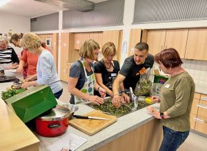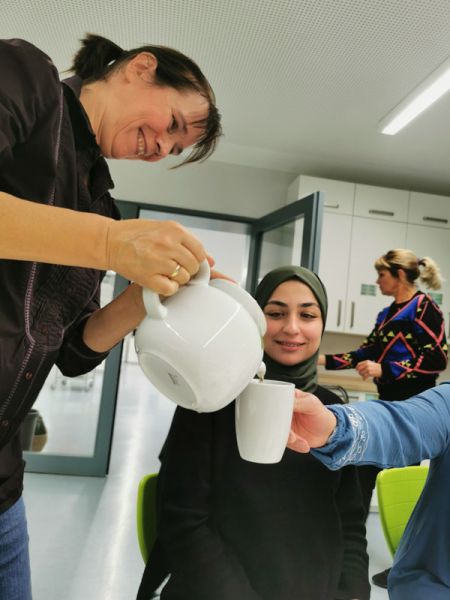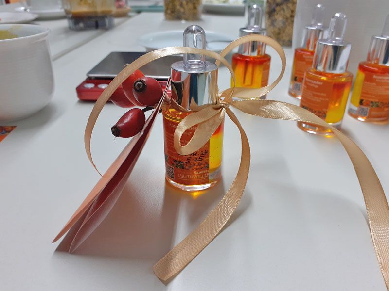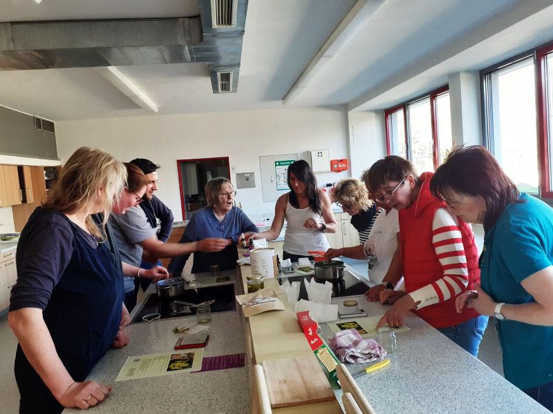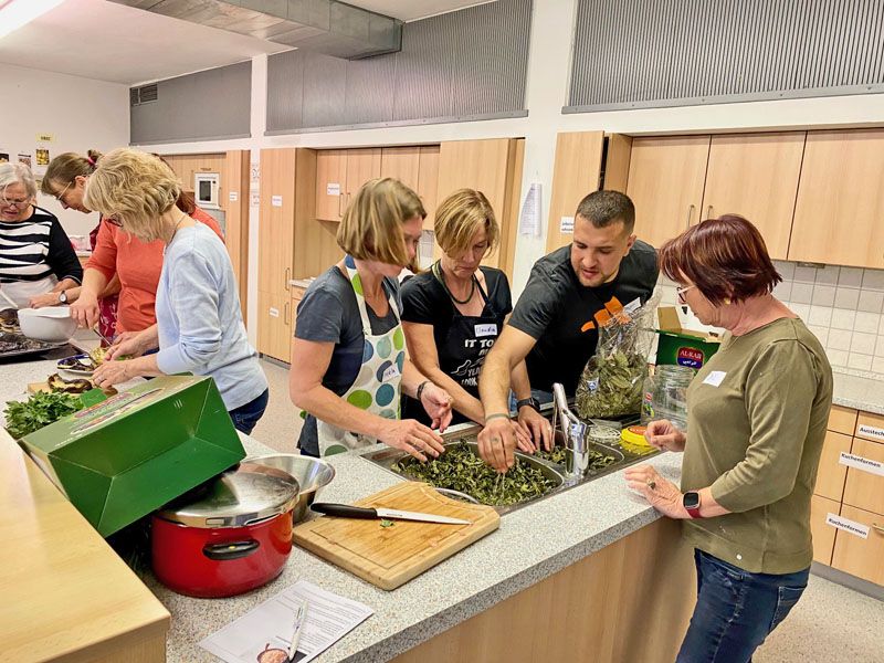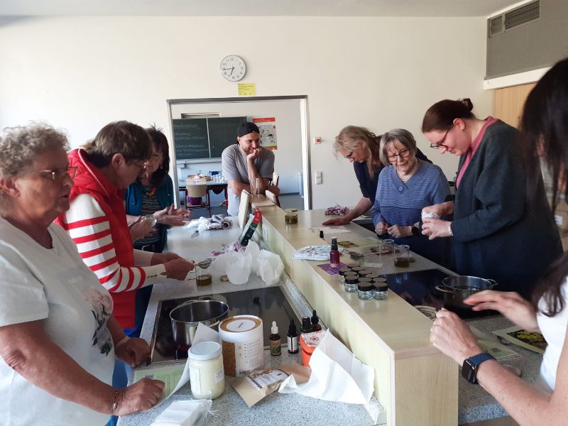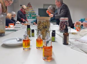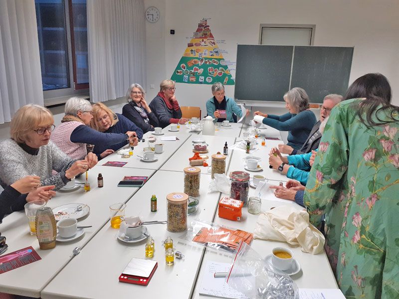 In der Küche der Umlachtalschule in Ummendorf fand am Freitag, den 22.11.2024 ein Kräuter- und Hautöl- Workshop für Ehrenamtliche der Migrationsarbeit unter der Leitung von Sandra Nechwatal statt. Um sich bei den Ehrenamtlichen zu bedanken und ein schönes Austauschtreffen zu bieten, hat die Ökumenische Migrationsarbeit Ihre Ehrenamtlichen eingeladen. Unter dem Motto „Tu Dir was Gutes“ kamen 14 Ehrenamtliche aus dem gesamten Landkreis zusammen und ließen sich mit Wildkräutertee, Dinkelvollkornseelen mit Brennesselsamen und Kräuterbutter, verschiedenen Ölen und gesundem Oxymel aus Sanddorn, Thymian und Honig verwöhnen.