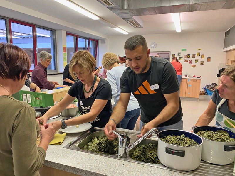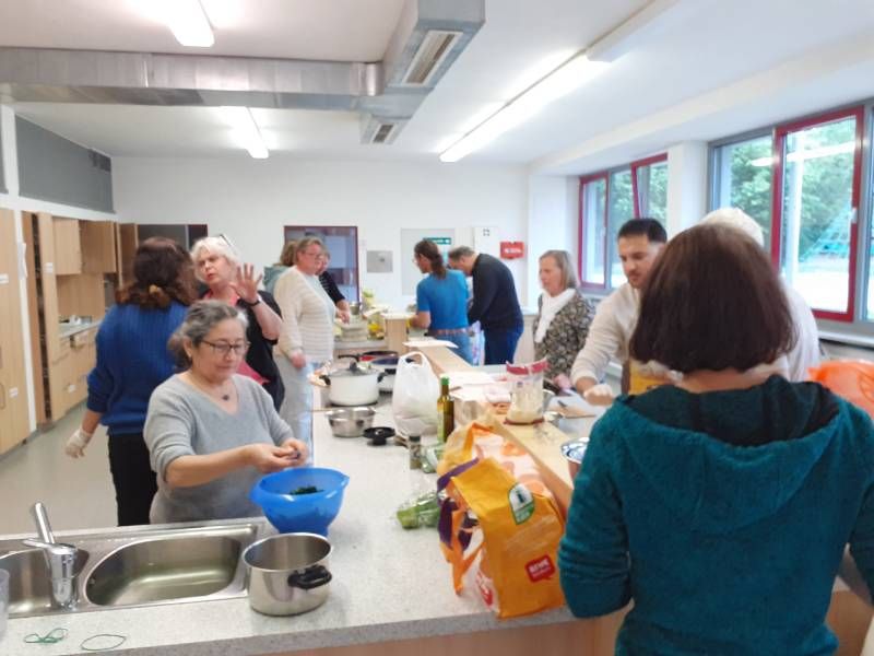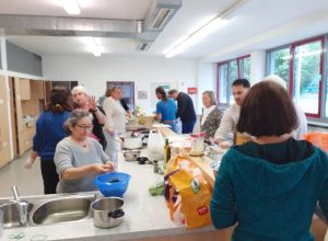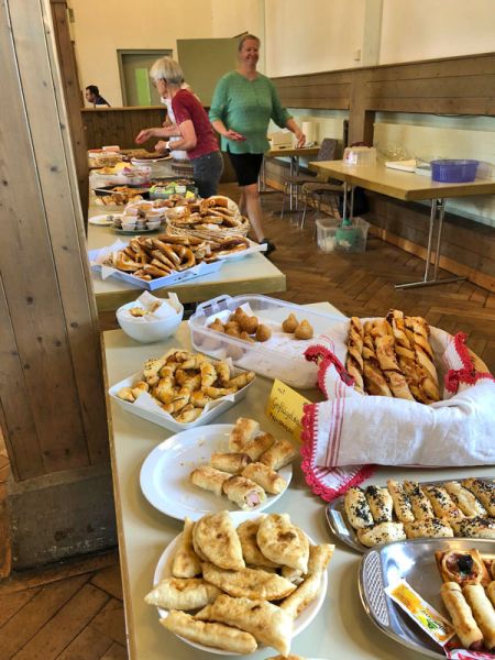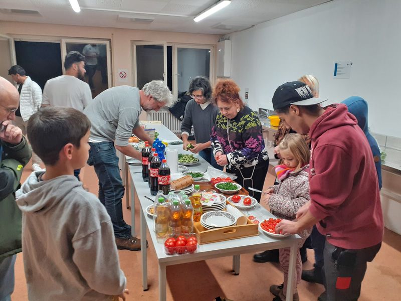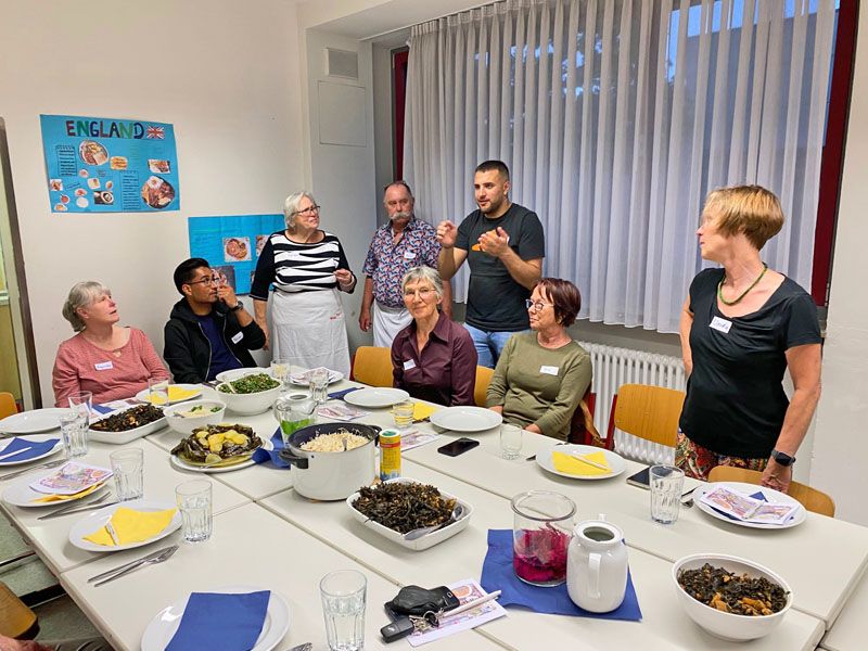 Dass Kochen Menschen auch ohne Worte verbindet und es einfach schön ist, mit vielen Menschen an einem reich gedeckten Tisch zu sitzen, konnten wir eindrücklich erfahren! Der Abend wurde organisiert von Ljubica Prodanovic, Projekt „ANNI – Ankommen nachhaltig integriert“ des cjd und Rahel Büttner der ökumenischen Migrationsarbeit.
