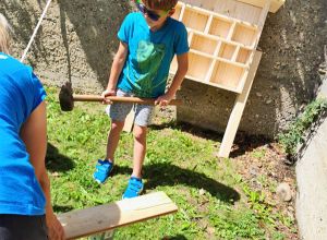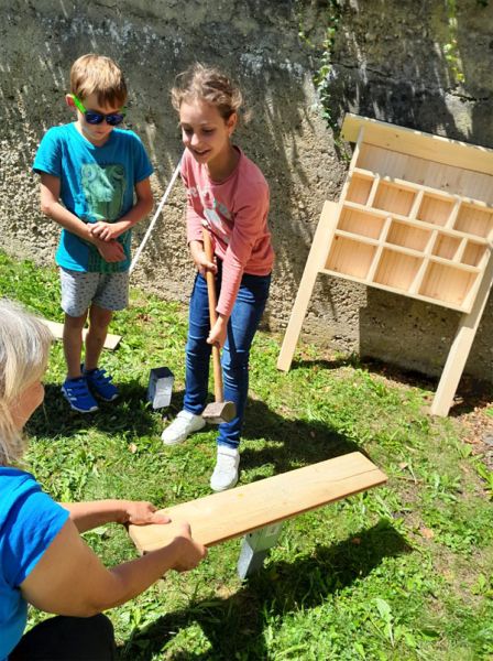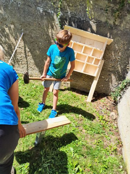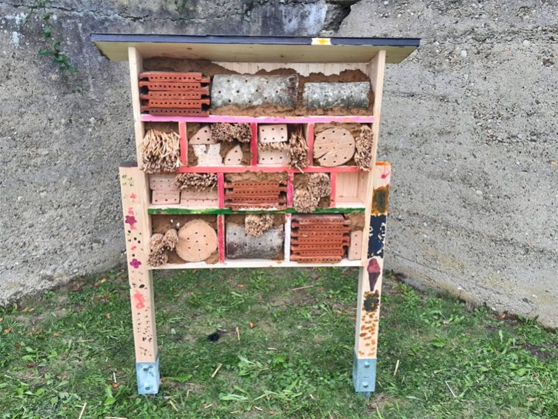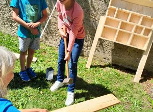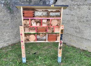 In den Sommerferien haben wir ebenfalls mit Frau Müller vom Nabu im Pfarrgarten ein „Wildbienenhotel“ aufgebaut.