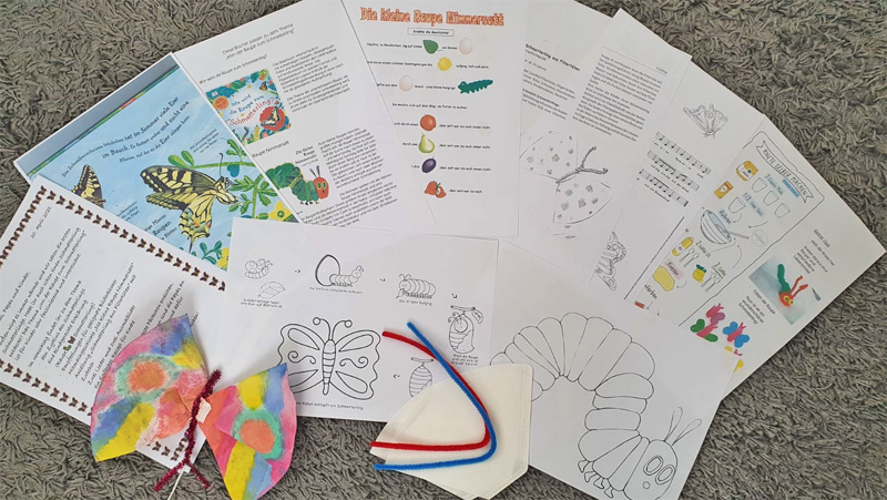 In einem unserer „Päckchen“ sind wir auf das Thema „Von der Raupe zum Schmetterling“ eingegangen. Wir beginnen immer mit einem kurzen und persönlichen Begrüßungsbrief. Nach dem Motto „für jeden ist etwas dabei“ haben wir den Zyklus des Schmetterlings mit kindgerechter und bildhafter Illustration, Empfehlungen für geeignete Bilderbücher, eine Mitmachgeschichte, eine Bastelanleitung „Schmetterling aus Filtertüten“ sowie die dazugehörigen Materialien, zwei Lieder, zwei Ausmalbilder und ein einfaches Rezept für selbstgemachte Knete in das „Päckchen“ gepackt.