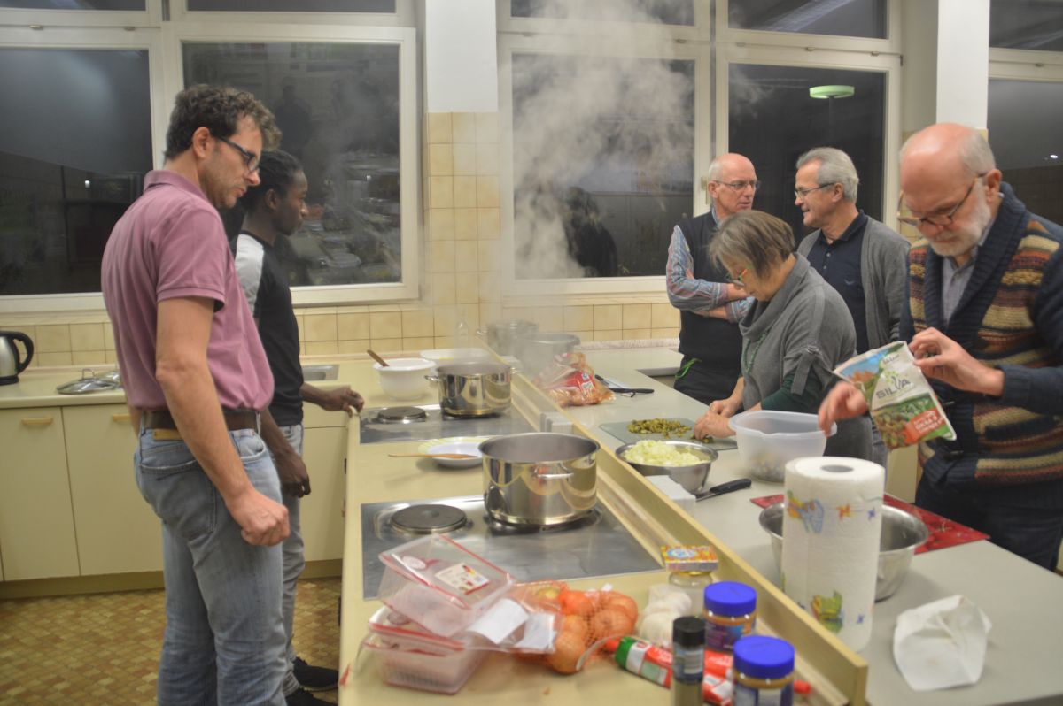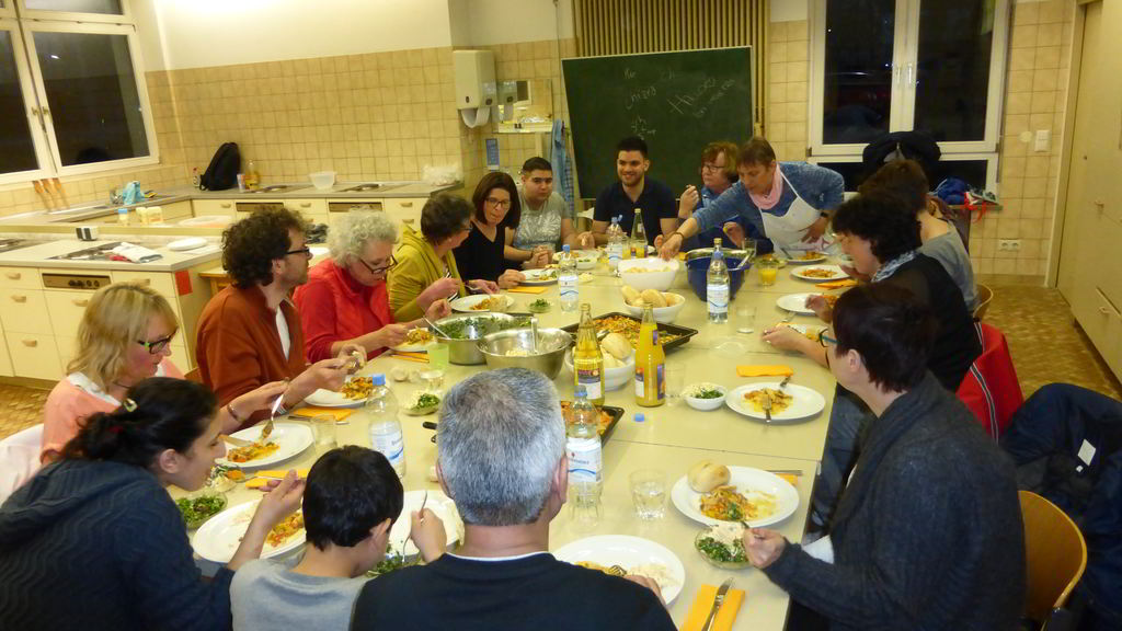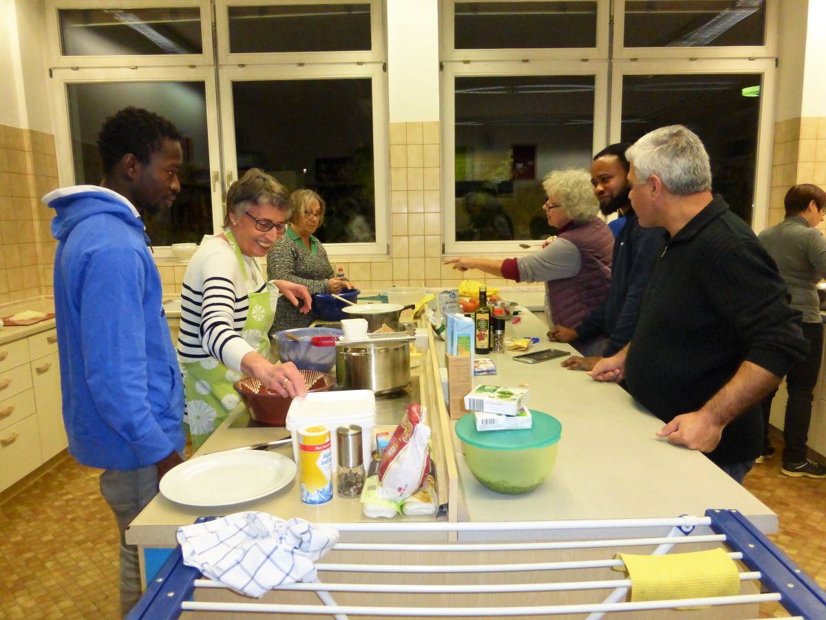 Nachdem in den vergangenen Monaten und Jahren in größeren Abständen zwei syrische Kochabende , ein nigerianischer und ein gambischer stattgefunden hatten, gab es nun endlich den versprochenen Kochabend mit Spezialitäten der schwäbischen Küche in der neuen Heimat. 4 Mitglieder des AK Asyl „Fremde brauchen Freunde“, eine Untergruppierung des Arbeitskreises Mehr miteinander, suchten die Rezepte aus und kochten sie in gemeinsamer Aktion. So gab es Kässpätzle ( genauer gesagt Knöpfle) mitgemischtem Salat, Maultaschen mit Kartoffelsalat, Linsen und Spätzle und zum Nachtisch Bratapfel mit Vanillesoße. Die Zubereitung machte allen Freude und ein junger Gambier erwies sich als versierter Spätzledrucker und Knöpfleschaber...auch das Zwiebelanbraten brauchte aufmerksame Köche und das Befüllen der Maultaschen wurde von den interessierten Lernwilligen mit Bravour gemeistert. Alle hatten alle Hände voll zu tun, bis das Buffet gedeckt, sich jedes sein Gericht selbst zusammenstellten konnte undsich die 11-köpfige Gruppe zum gemeinsamen Essen an den zwischenzeitlich gedeckten Tisch setzte. Bei angeregten Gesprächen wurde gegessen und danach die obligatorischen Reste für daheim zusammengepackt und gemeinsam die Küche wieder aufgeräumt. Die neuen Gerichte fanden allgemein Anklang und die Rezeptblätter wurden gerne mitgenommen. Alle gingen gut gesättigt und gut gelaunt gegen 21.45 nach Hause, in der Gewissheit , einen schönen gemeinsamen Abend verbracht zu haben.