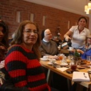Foto: Zum Adventskaffee hat Lydia Gebhart (Mitte) am Samstag Flüchtlinge und deren Betreuer zum Adventskaffee in das Klostercafè nach Sießen eingeladen. Links Kameleya Yalda aus Syrien, deren Mann im Krieg in ihrer Heimat ums Leben kam