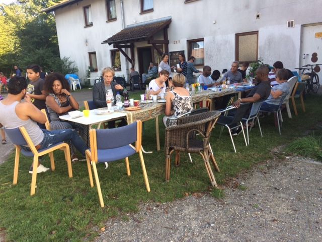Das Warten auf einen guten Termin hatte sich gelohnt, ein wolkenloser warmer Augustabend trug zur angenehmen , fröhlichen Atmosphäre des Sommerfestes nicht unerheblich bei. Statt des wöchentlichen dienstäglichen Asylcafes gab es vergangenen Dienstag ab 16:30 Uhr ein Sommerfest, zu dem auch etliche der inzwischen in eigenen Wohnungen lebenden Asylbewerber dazukamen. Die Organisatorinnen des AK Asyl „Fremde brauchen Freunde“ hatten bewusst aufs Grillen verzichtet, da die Personenzahl immer schwer einzuschätzen ist. Stattdessen gab es eine bunte Tafel mit verschiedenen Salaten, salzigem Gebäck, Brotaufstrichen und Desserts , an dem sich alle gerne bedienten.So saßen Bad Saulgauer am langen Tisch neben Syrern, Nigerianern, Gambiern, einem Afghanen, einem Ghanaer und Kindern einer Familie aus dem Kosovo. Es wurde gegessen, getrunken ( Mineralwasser und Apfelsaftschorle)geredet, gelacht, die Gitarrengruppe gab eine kleine Kostprobe ihrer Übungstreffs, es wurde Tischtennis gespielt und Federball …...und der schöne Sommerabend gemeinsam genossen. Eine willkommene Abwechslung im Alltag der Bewohner der Bad Saulgauer Unterkünfte.