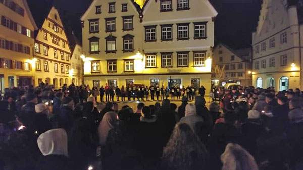 260 Leute in Biberach, 60 Leute in Mettenberg bei Biberach, 8 in Maselheim, 20 in Riedlingen, sogar in Leutkirch auf dem Kornhausplatz waren es 120. Und viele Einzelne haben ein Licht in Ihr Fenster gestellt.