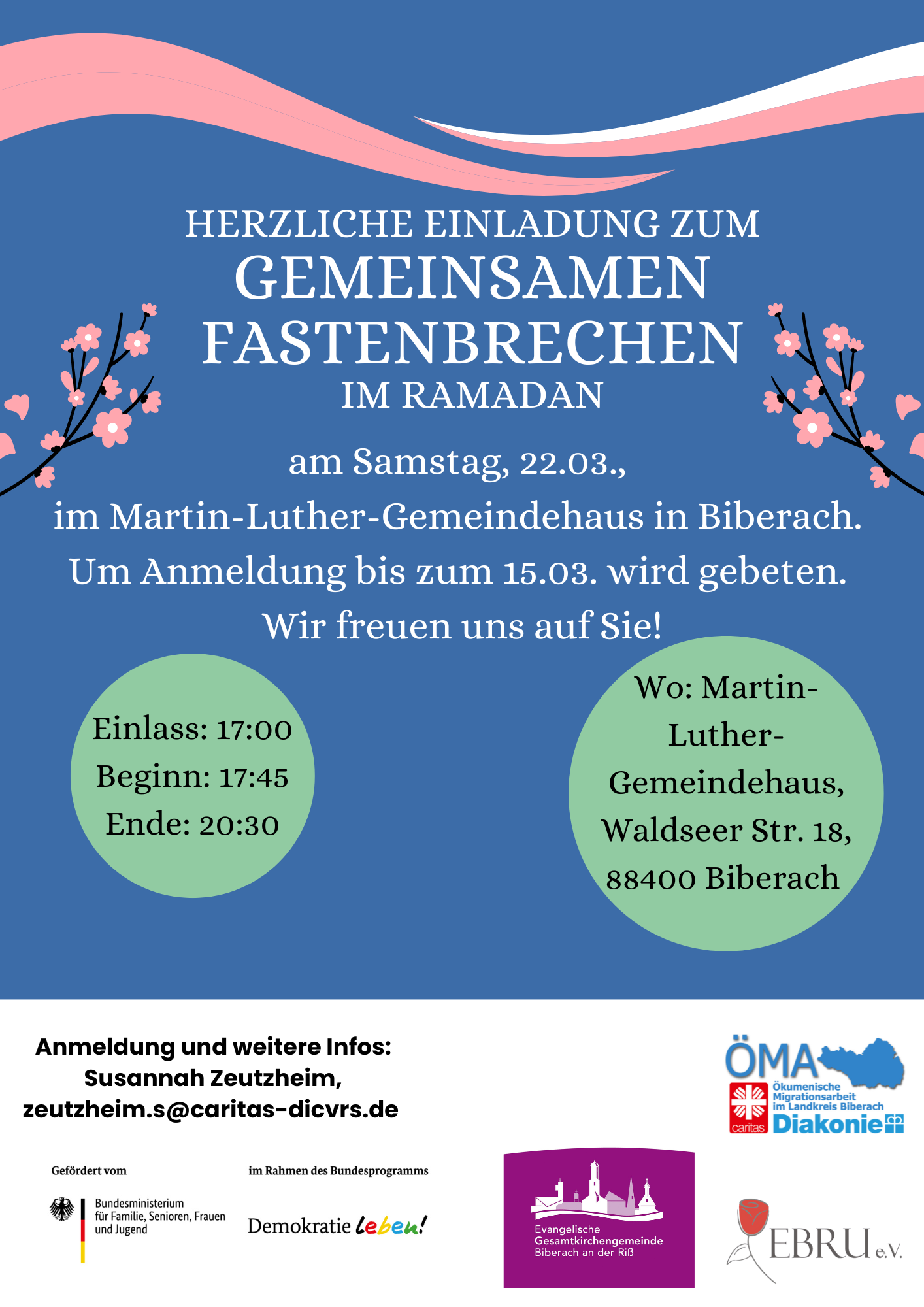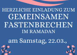 wir laden Sie herzlich ein, gemeinsam mit uns das Fastenbrechen im Ramadan zu feiern. Es erwartet Sie ein schöner Abend zum gemeinsamen Austausch und gegenseitigen Kennenlernen, der im interreligiösen und interkulturellen Miteinander stattfindet.