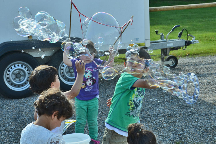 Zudem konnte das Spielmobil der Stadt Laupheim gemietet werden. Nach anfänglich skeptischen Blicken der Kinder wurde das Angebot allerdings rege genutzt. Ein Höhepunkt stellten sicherlich die großen Seifenblasen dar. Ein Hingucker nicht nur für die Kinder, sondern auch für die Erwachsenen.