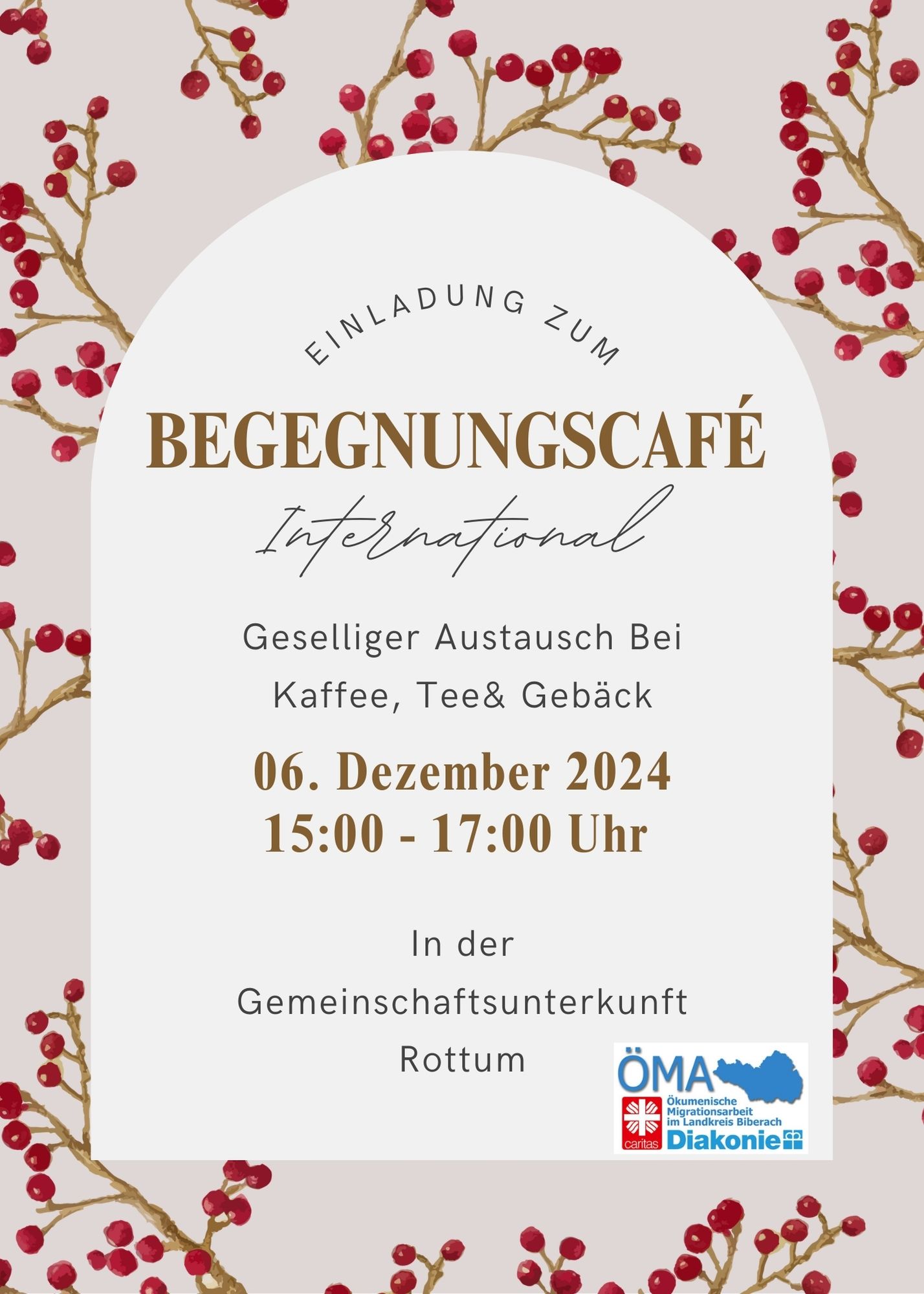 Am Freitag, den 06. Dezember 2024 findet ab 15 – ca. 17 Uhr in der Gemeinschaftsunterkunft in Rottum ein buntes Beisammensein statt. Veranstaltet wird das Begegnungscafé von Ehrenamtlichen des Helferkreises sowie der Ökumenischen Migrationsarbeit von Caritas und Diakonie.