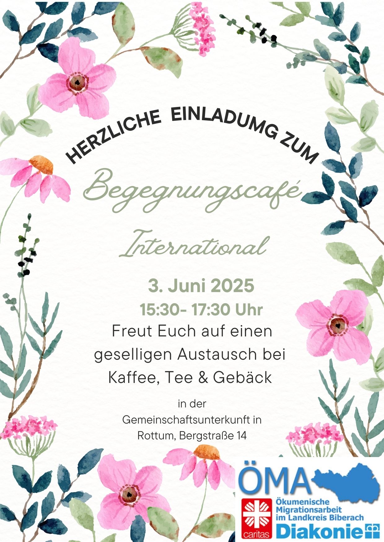 Am Dienstag, den 03. Juni 2025 findet ab 15:30 Uhr in der Gemeinschaftsunterkunft in Rottum ein geselliger Austausch statt. Veranstaltet wird das Begegnungscafé von Ehrenamtlichen des Helferkreises sowie der Ökumenischen Migrationsarbeit von Caritas und Diakonie.