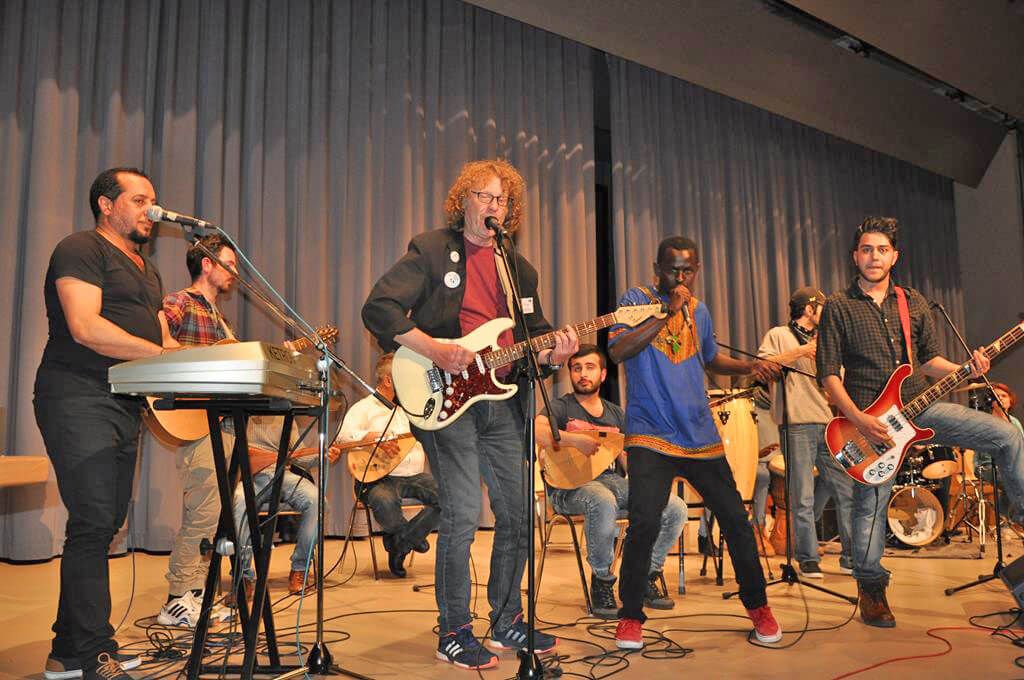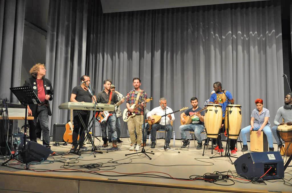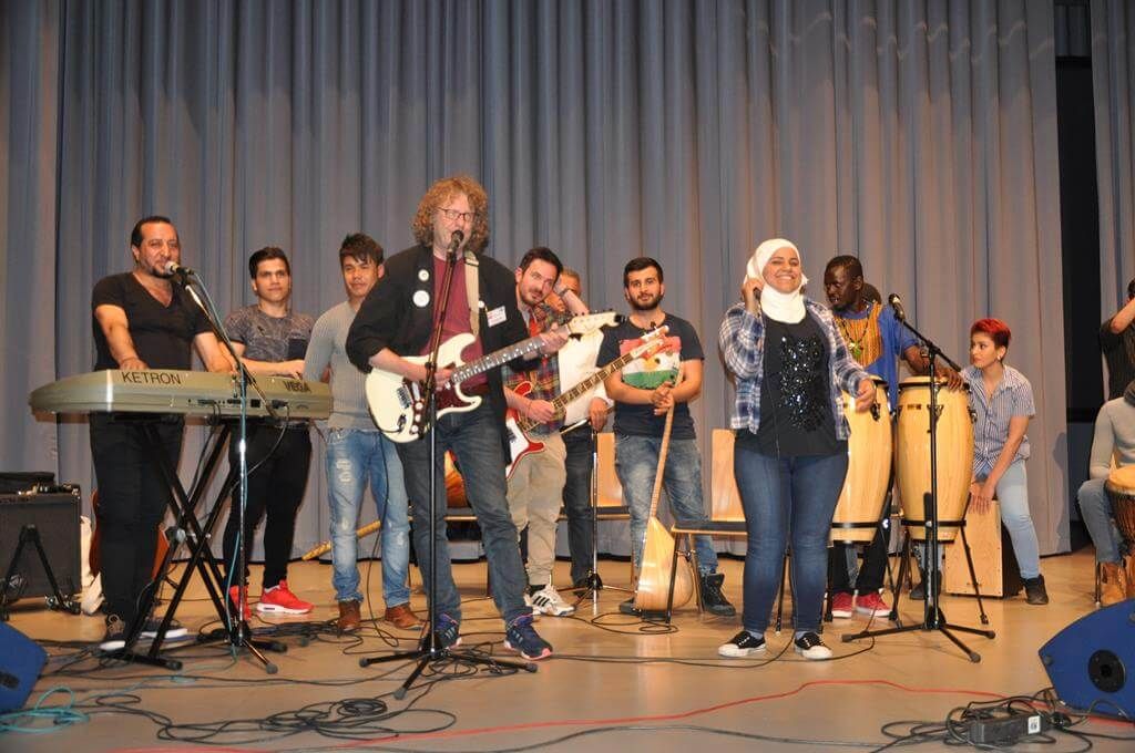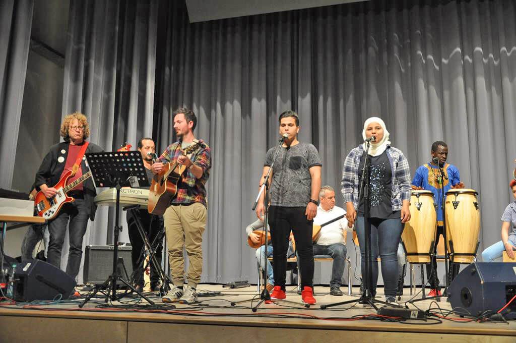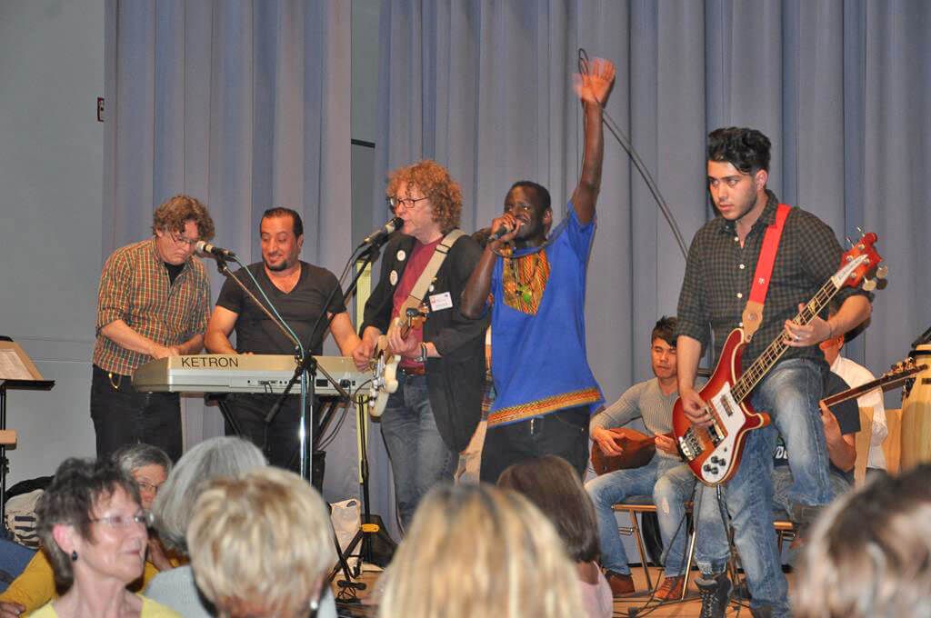 „Schade, dass das Fest schon zu Ende ist“ war einhelliger Tenor der gut 350 Besucher des Interkulturellen Maifestes am 6. Mai 2017 in der Gemeindehalle. Zur Musik der Band International Identity, in der neben Biberachern auch Frauen und Männer aus Syrien, Afghanistan, Iran und Gambia singen und spielen, animierte zum ausgelassenen Mittanzen. Vier Stunden zuvor hatte Moderator Rolf Walter im Namen des Unterstützerkreises für Flüchtlinge Ummendorf die Gäste in der voll besetzten Halle begrüßt. Die Sängerinnen des FIS Chores Rissegg sorgten mit ihren interessant arrangierten Friedensliedern für nachdenkliche Stimmung, luden aber auch zum Mitsingen ein. Vielen Dank der Chorleiterin Monika Lessmeister mit ihren Sängerinnen und Lorenz Lessmeisters Begleitband.