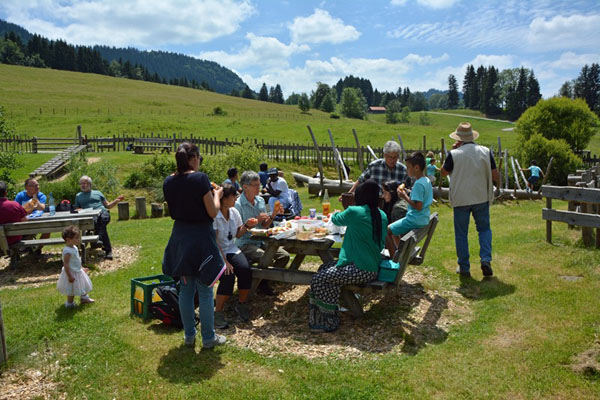 Einige der Frauen im strengen Hijab, gemäß der moslemischen Kleidungsvorschrift mit langärmeligen Blusen oder leichten Mänteln samt Kopftuch, waren froh, als endlich die Picknickpause angesagt war; sie fanden auf Nachfrage die Gehstrecke zu lang. Was einen jungen Syrer auch vorschlagen ließ, solche Ausflüge doch lieber getrennt für Männer und Frauen zu organisieren, da Frauen ja meist nicht so gerne wandern. Ein Vorschlag, der bei den Deutschen auf Unverständnis stieß und auch einige ihrer Frauen erklärten, dass sie durchaus gerne spazieren gehen. Eine afghanische Mutter läuft sogar regelmäßig den Weg zum Deutschkurs nach Biberach zu Fuß. Tatsächlich blieben dann die Familien mit kleinen Kindern noch länger beim Picknick, während andere unbedingt weitergehen wollten, um den versprochenen Bergblick zu genießen.