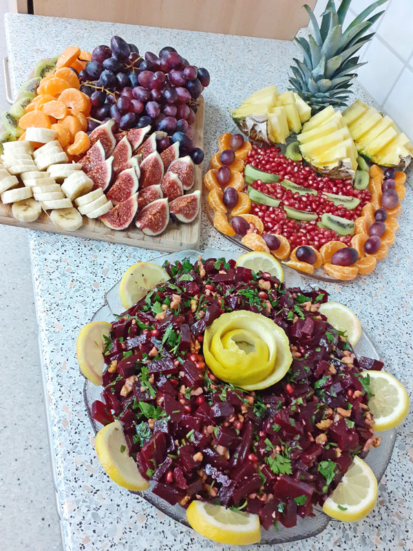 Hasan und Samer hatten an vier Kochstellen schon viel vorbereitet, um Baba Ganoush, ein Auberginenpüree, und Molokhyia mit gebratenem Hähnchen zuzubereiten. Einige Helferinnen wuschen dafür sorgfältig die getrockneten Blätter einer Art Spinat. Nebenan schnitt man riesige Petersilie-Büschel in feine Streifen. Mit Tomaten, Minze, Bulgur, Olivenöl, Minze und Granatapfelsirup wurden sie zu Tabouleh, einem sehr vitaminreichen Salat, verarbeitet. Außerdem wurden syrischer Fadennudelreis und gefüllte Weinblätter mit Kartoffeln gekocht. Alleine 37 Zitronen waren für die verschiedenen Gerichte auszupressen. Als die Mägen bereits leise knurrten, schob Hasan noch schnell Babousa in den Ofen, einen Grieskuchen mit Kokos und Mandeln.