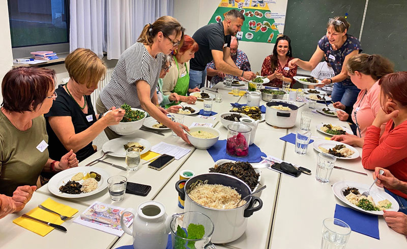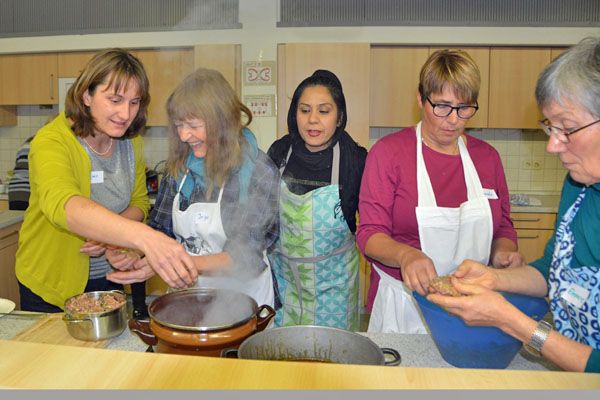 Der schön gerichtete Tisch bog sich beinahe unter all den Speisen, die in bester Stimmung gemeinsam genossen wurden. Einiges davon wurde in Plastikbeutelchen zusammen mit der schön gestalteten Rezepte-Sammlung mit nach Hause genommen. Ein paar Teilnehmerinnen fragten zum Abschied, wann der nächste Kochkurs stattfindet. Ein Kompliment für den umsichtigen Hasan, der sich sichtlich freute, wie gut das Essen aus seiner alten Heimat auch den Menschen in der neuen Heimat schmeckte.