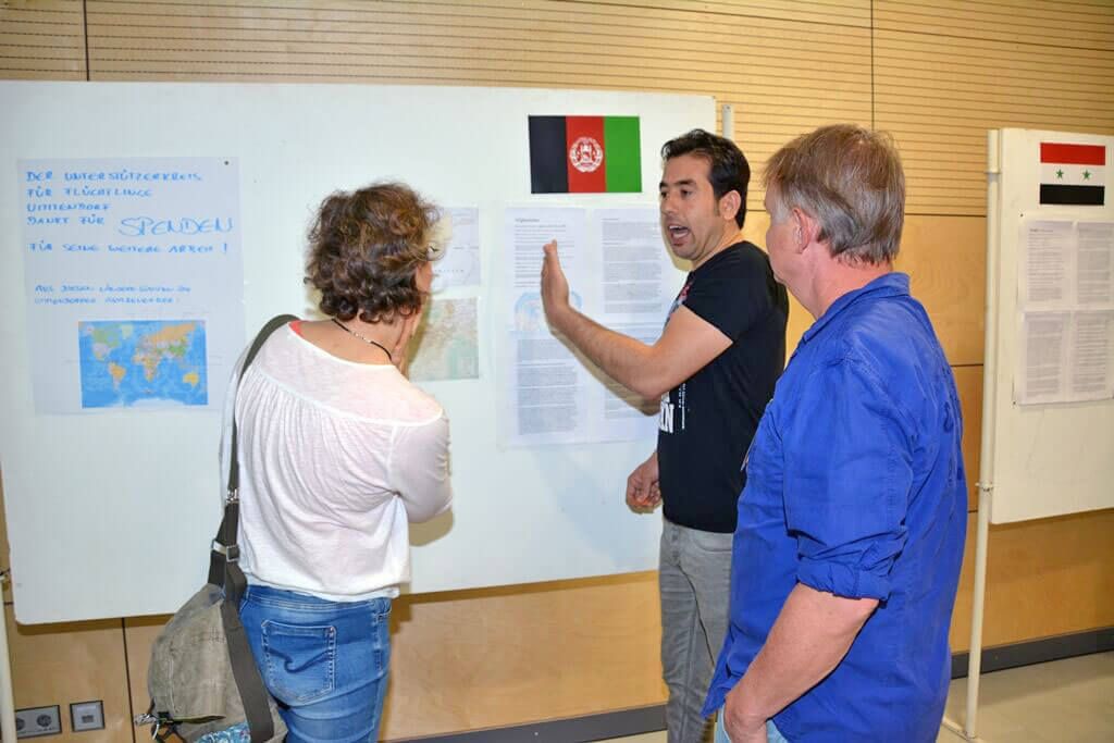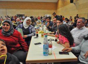 An den Informationswänden wurde viel gelesen und diskutiert, für manche Ummendorfer und Fischbacher haben „die Flüchtlinge“ jetzt ein Gesicht und einen Namen. Auf der Bühne bedankte sich Gemeinderat Simon Özkeles im Namen des Bürgermeisters Klaus B. Reichert beim Unterstützerkreis für geleistete Arbeit, die für eine gelungene Integration maßgeblich war. Ursula Schmid-Berghammer von der Ökumenischen Flüchtlingsarbeit der Diakonie Biberach schloss sich an und hob vor allem die Arbeit der der Sprecherin des Unterstützerkreises Eleonore Laib hervor. Sie gibt die Leitungsarbeit, nicht die Mithilfe, nach jetzt zwei Jahren wegen größerem Unterstützungsbedarf in der Familie ab und sagt: Alles ist in guten Händen bei der Integrationsbeauftragten der Gemeinde und dem engagierten und sehr kompetenten Kernteam.