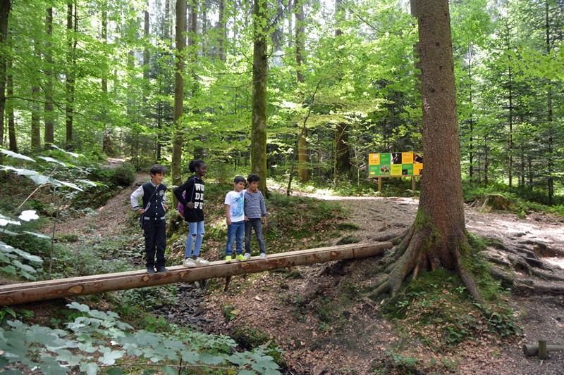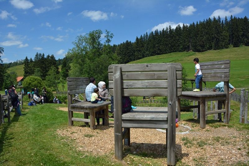 Was ihm besonders aufgefallen sei, frage ich einen Geflüchteten aus Gambia nach einem gemeinsamen Ausflug ins Allgäu. Der örtliche Unterstützerkreis für Flüchtlinge hatte den Tag organisiert, eine Busfahrt von Ummendorf nach Weitnau und die Wanderung. Die Gruppe mit kleinen Kindern ging auf dem Carl-Hirnbein-Weg bis Missen-Wilhams, Jugendliche erkundeten zusätzlich den Eistobel bei Isny. Der Carl-Hirnbein-Weg, benannt nach dem Mann, der Mitte des neunzehnten Jahrhunderts den Käse ins Allgäu gebracht, die Milchwirtschaft gefördert und auf dem Grünten das erste Hotel gebaut hat, ist durch seine Spielmöglichkeiten, Barfußwege und Bäche vor allem für Kinder sehr attraktiv. Keiner der Syrer, Iraker, Afghanen oder Gambier, die alle bereits über zwei Jahre im Landkreis leben, war zuvor in dieser Gegend. Entsprechend beindruckt zeigten sie sich. Der Mann aus Gambia vor allem davon, dass die Kühe so viel zu fressen haben. Ein junger Afghane schwärmte zudem von dem weiten Blick auf die Berge und von „dem grünen Wald“.