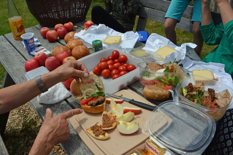 Während das satte Grün für uns Einheimische ganz selbstverständlich ist, kommen alle die Geflüchteten, die mit uns unterwegs sind, aus Gegenden, in denen Wasser ein knappes Gut ist. Die fruchtbare Landschaft ist daher etwas ganz Besonderes für sie. Was hingegen uns begleitenden Deutschen auffiel, die gerade mal ein Vesperbrot und einen Apfel im Rucksack hatten, war, was alles aus den Tragtaschen der Migranten gefördert wurde. Noch am Morgen vor dem Ausflug Selbstgebackenes: mit Hähnchenfleisch gefülltes Brot, duftende Fleischbällchen und Gebäck. Alles wurde auf den Holztisch am Pausenplatz oder auf die selbstverständlich mitgebrachte Picknickdecke gehäuft. Fein in Streifen geschnittene Kräuter, Tomaten und Paprika wurden mit dem Fleisch in aufgeschnittenes Fladenbrot gefüllt, und ganz selbstverständlich teilte man alles mit den Umsitzenden. Wir hatten keine Chance mit unserem höflichem Ablehnen. Die Frauen gaben keine Ruhe, bis man nicht in ein süßes Gebäck gebissen oder einen Schluck Tee gekostet hatte.
