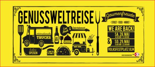 Am 29.05.2016 nahem wir (2 Paare) ca. 4 junge Männer, aus der Unterkunft, mit zum Streetfood Markt. Mit einer Gruppenkarte fuhren wir im Zug nach Ulm und verbrachten bei schönem Wetter einige Stunden bei internationalen kulinarischen Angeboten auf dem Volksfestplatzgelände.