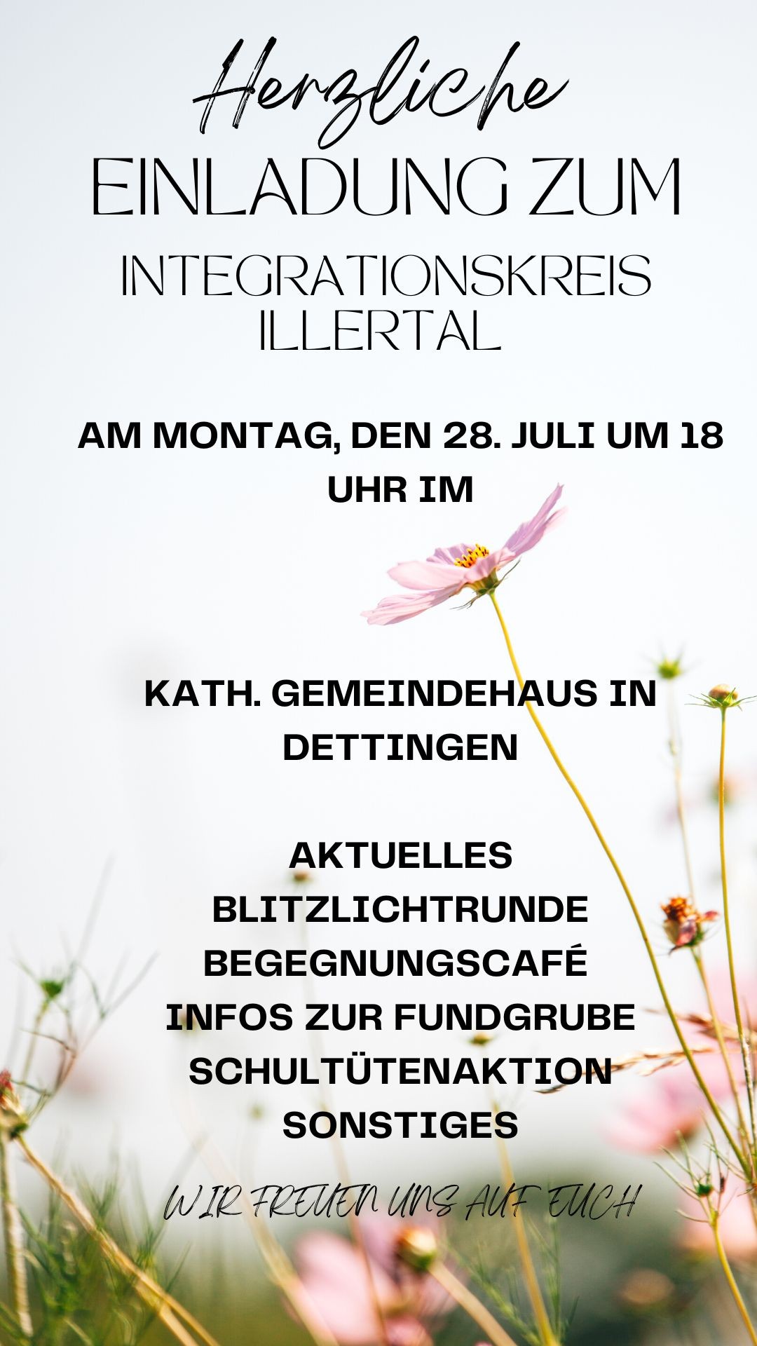 HERZLICHE EINLADUNG ZUM AUSTAUSCHTREFFENINTEGRATIONSKREIS ILLERTALMontag, den 28. Juli 2025 um 18 UHR imKATH. GEMEINDEHAUS IN DETTINGENAKTUELLESBLITZLICHTRUNDE BEGEGNUNGSCAFÉINFOS ZUR FUNDGRUBE SCHULTÜTENAKTIONSONSTIGESWIR FREUEN UNS AUF EUCH