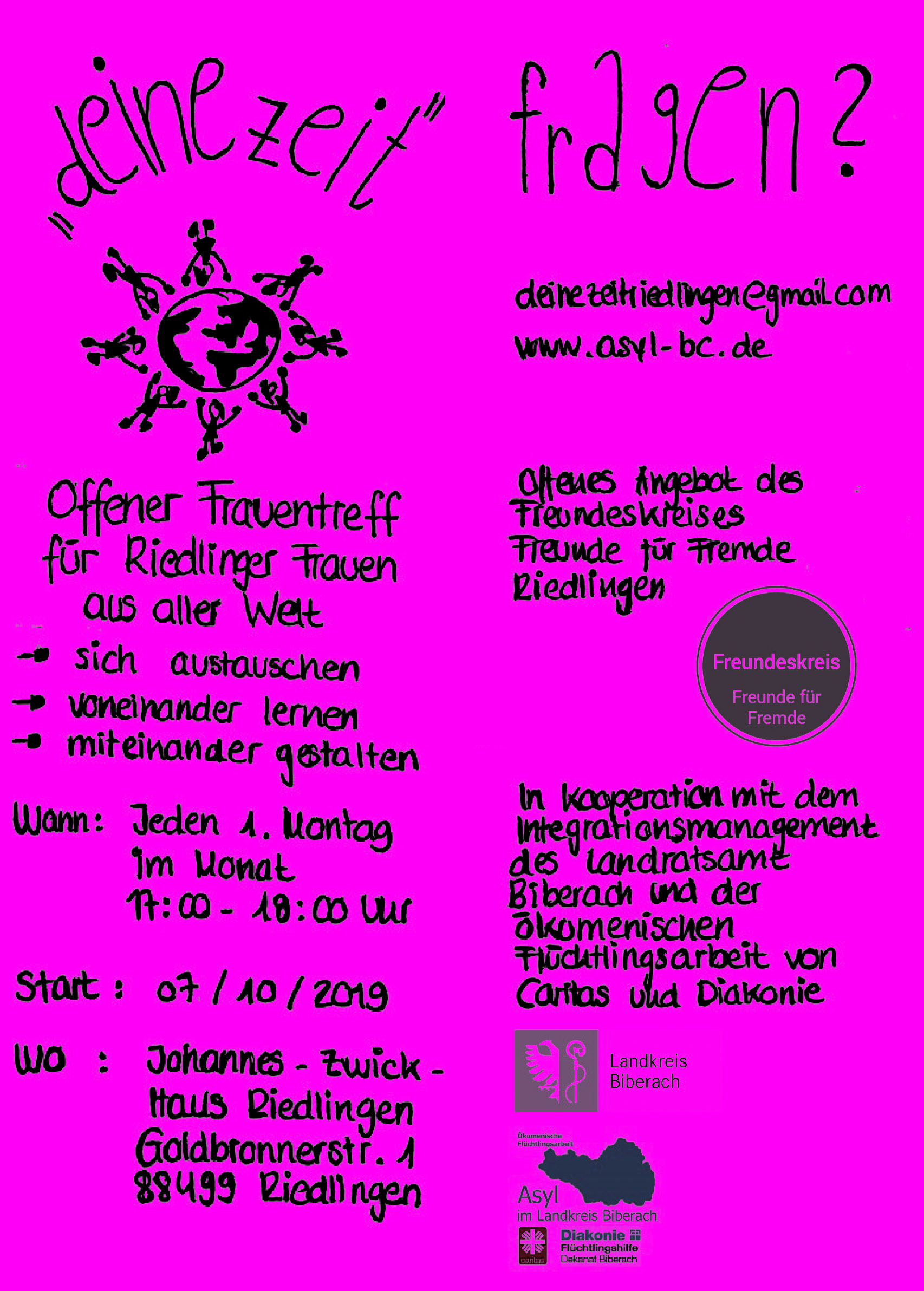 lautet das Motto des offenen Frauentreffs zu dem eine Initiativgruppe aus dem Freundeskreis „Freunde für Fremde“ Riedlingen am Montag, 7. Oktober 2019, von 17 bis 19 Uhr ins Johannes-Zwick-Haus, Goldbronnenstr. 1 einlädt. Angesprochen sind alle Frauen, die sich jeden ersten Montag im Monat eine kleine Auszeit von ihren Alltagspflichten gönnen wollen und neugierig sind auf die Begegnung und den Austausch mit anderen Frauen aus Riedlingen und Umgebung – ob einheimisch oder zugezogen. Über welche Themen gesprochen wird und welche Aktivitäten miteinander unternommen werden, bestimmen die teilnehmenden Frauen. Die Syrerin Dima Zaza, Initiatorin und Teil des Orgateams aus Ehrenamtlichen des Freundeskreises und Hauptamtlichen von Landratsamt und Ökumenischer Flüchtlingsarbeit von Caritas und Diakonie, ist begeistert von der Aussicht, mehr über das Leben in ihrer neuen Heimat zu erfahren, gemeinsame Interessen mit anderen Frauen zu entdecken und ihre bereits guten Deutschkenntnisse freundschaftlich weiter zu verbessern.